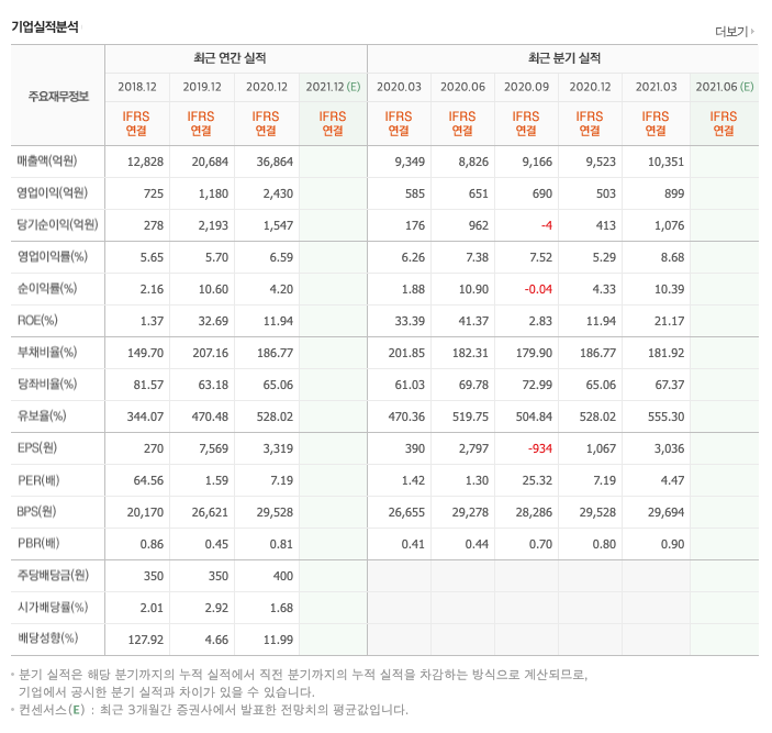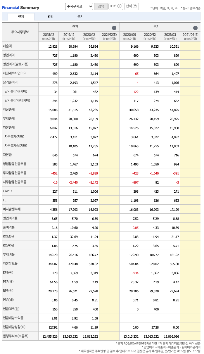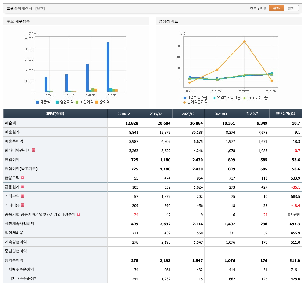 매출액 : 2018년 12,828억원, 2019년 20,684억원, 2020년 36,864억원으로 증가, 2021년 1분기 10,351억원으로 전년동기대비 증가 하였습니다. 2021년 1분기는 전년동기대비 10.7% 증가하였습니다. 2020년 분기별로 보면 2분기 8826억원, 3분기 9166억원, 4분기 9523억원입니다.