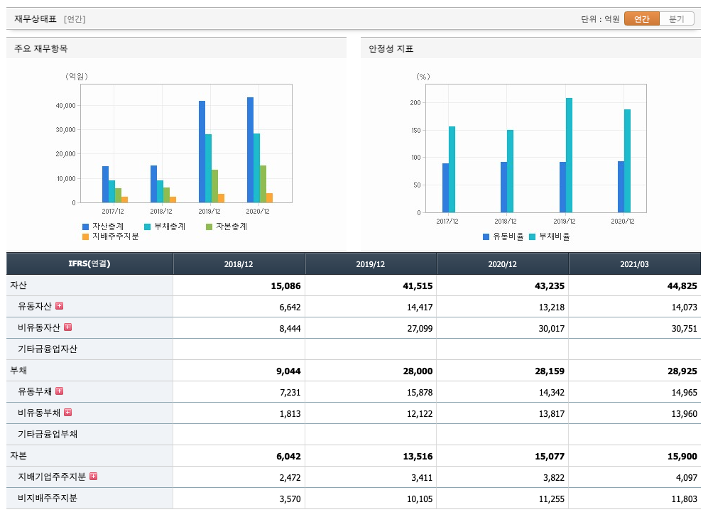 자산은 2018년 15,086억원, 2019년 41,515억원, 2020년 43,235억원, 2021년 1분기 44,825억원으로 증가하였습니다.