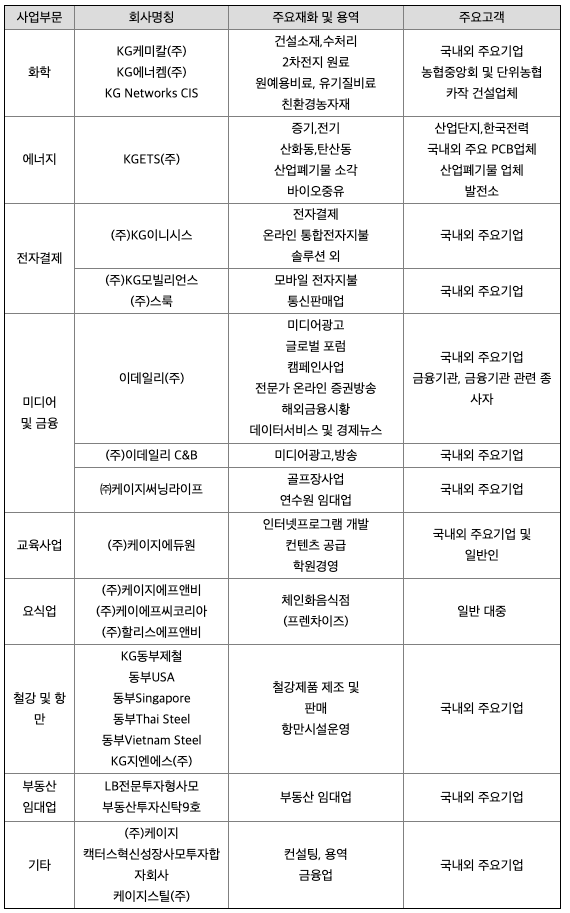KG동부제철㈜와 연결대상 종속회사(이하 '연결회사')는 냉연강판, 각종표면처리강판을 주요제품으로 생산 및 판매하는 KG동부제철㈜(지배회사)와 동종업을 영위하는 종속회사로 구성된 철강 전문회사입니다.