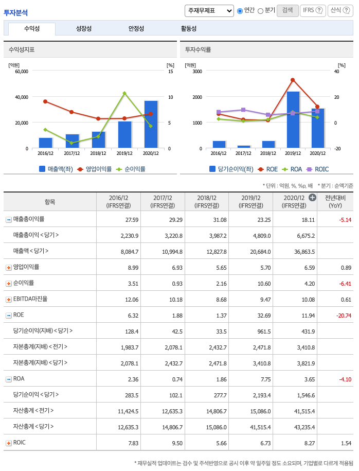 ROE(Return On Equity, 자기자본순이익율, 주주의 관점) : 2016년 약 6%, 2017년 약 1%, 2018년 약 1%, 2019년 약 32%로 증가, 2020년 약 11%으로 감소하였고, 자기자본순이익율은 이상율(10%)보다 높습니다.
