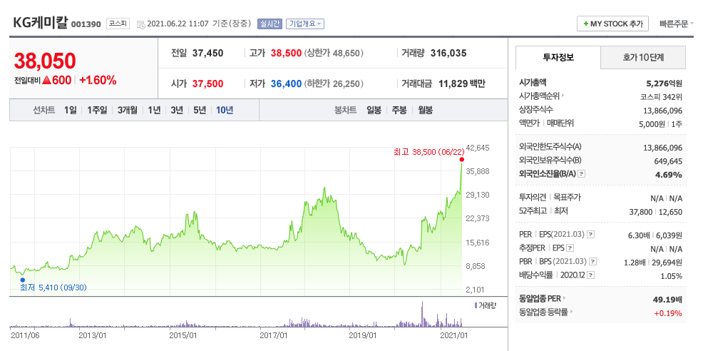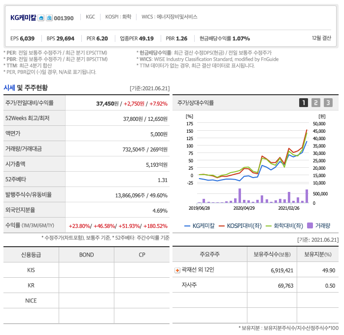 | KG케미칼 | 37,950원 | 30,204원 | 30,532원 | 31,279원 |