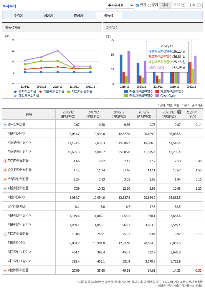 **매출채권회전일수(=돈을 받는 순환일 수) 약 36일, 재고자산회전일수(=재고자산 빠지는 일수) 약 36일, 매일채무회전일수(=돈을 늦게 줘도 되는 일 수) 약 25일이고, Cash Cycle(현금회전율) 약 47일로 현금운영이 안정적이지 않습니다.