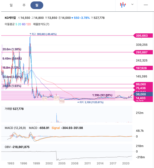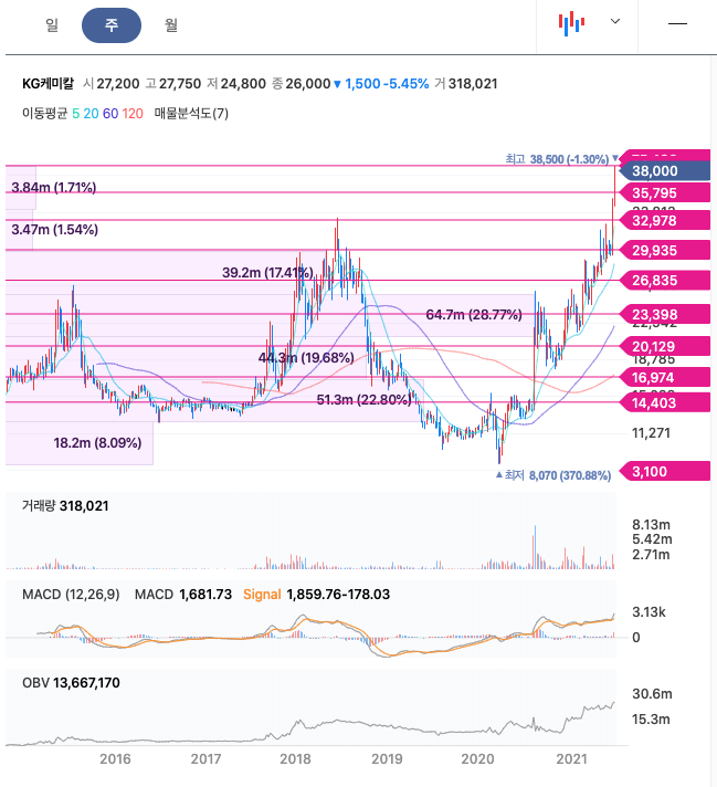 KG케미칼은 20년 8월 급등하였고, 이후 횡보를 하다가 21년 2월이후 우상향하고 있고, 21년 6월 38,500원을 찍었습니다.