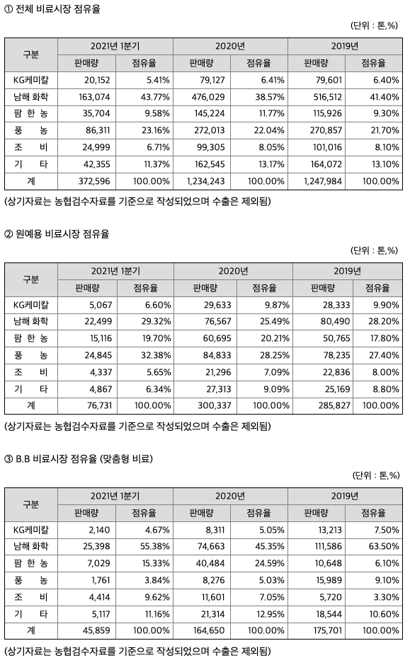 비료사업부문 2019년 12월 누계 비료출하량은 약 144천톤 매출액은 592억원으로 그 국내 비료 시장점유율은 약 6~7% 정도입니다. 당사는 온산 등 생산시설의 다거점화를 통한 비료의 적기생산 및 적기공급을 실현하고 있으며, 친환경 고품질 비료에 대한 관심이 점차 증가함에 따라, 온산에 유기질 생산시설을 갖춤으로써 유기질 및 유기물 함유비료의 확대공급을 추진하고 있습니다. 또한 친환경공장의 자동화설비를 통하여 친환경 생물농약 판매증대 및 완효성을 포함한 특수한 비료, 미생물제재, 지역별 특성화된 농자재 제품개발을 통한 매출 및 이익증대를 추진하고 있습니다. 2011년 연초에는 생물제제 시장진출을 위해 KG바텍과 합병하여 연간2,000톤 생산규모의 생산시설을 갖춰 친환경 농업, 생명농업토탈기업으로 변모하고 있습니다. 또한 금년부터 신제품인 미생물비료의 공급으로 수익성이 향상되고 있습니다.