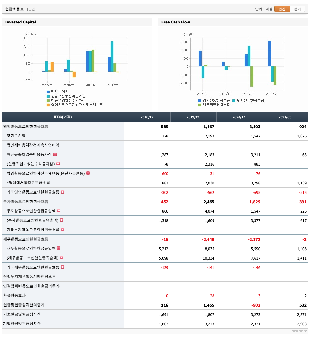 영업활동 현금흐름 : 2018년 585억원, 2019년 1467억원, 2020년 3103억원, 2021년 1분기 924억원으로 영업활동 현금흐름이 원활합니다.